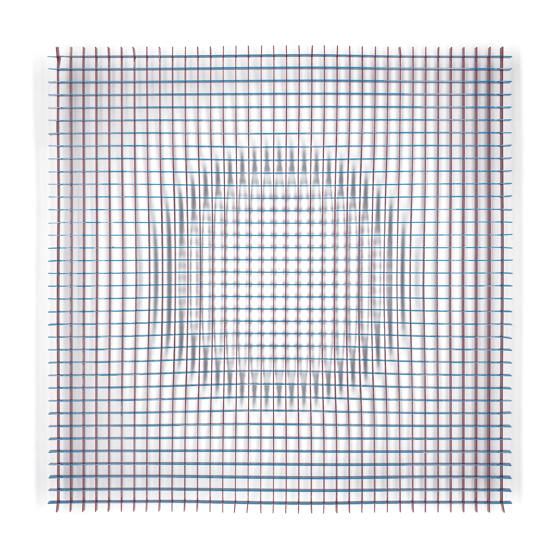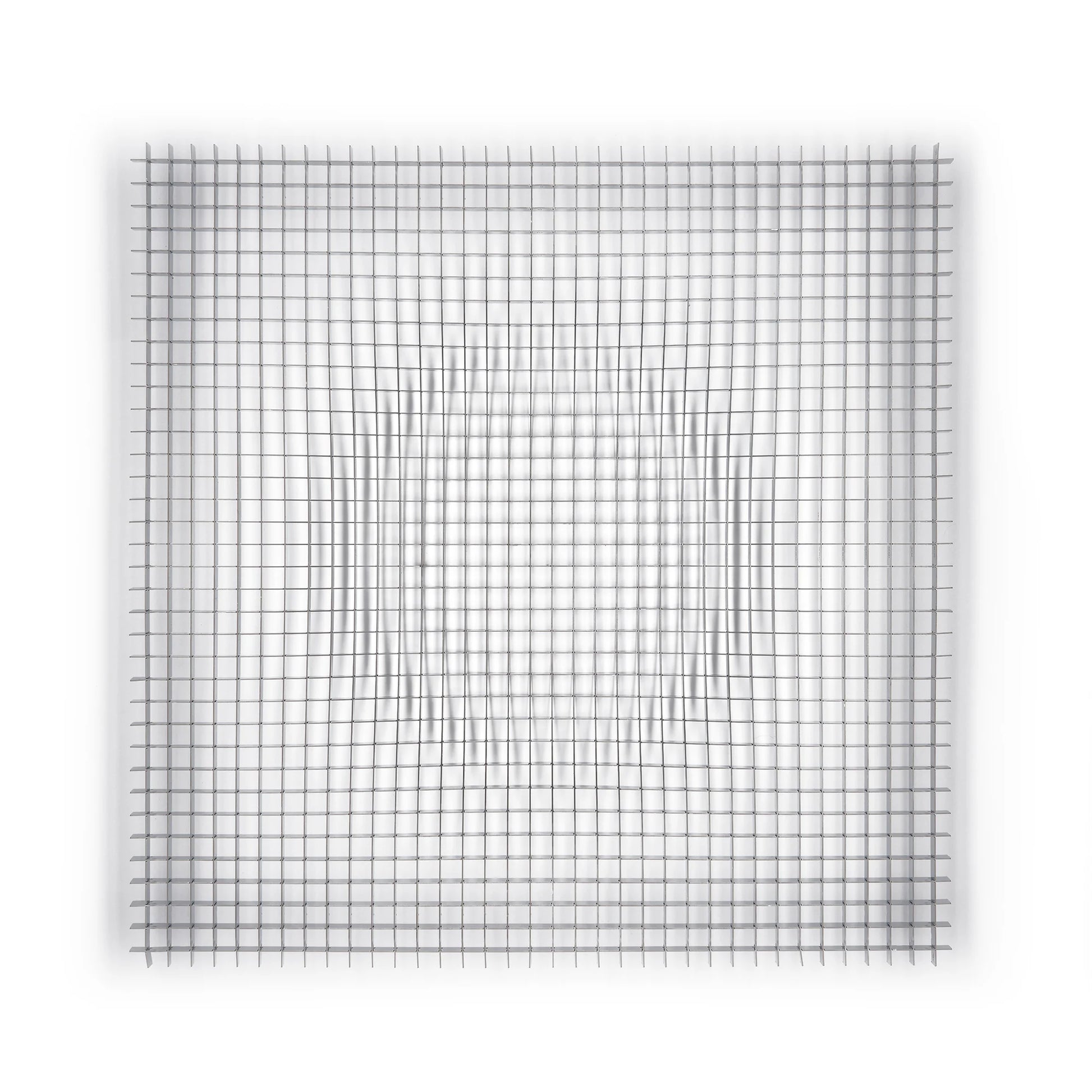 Ein skulpturales Edelstahl-Objekt, dessen verzogenes Gitter futuristische Raumkrümmung zitiert und sich dank flexibler Konstruktion individuell ausrichten lässt.