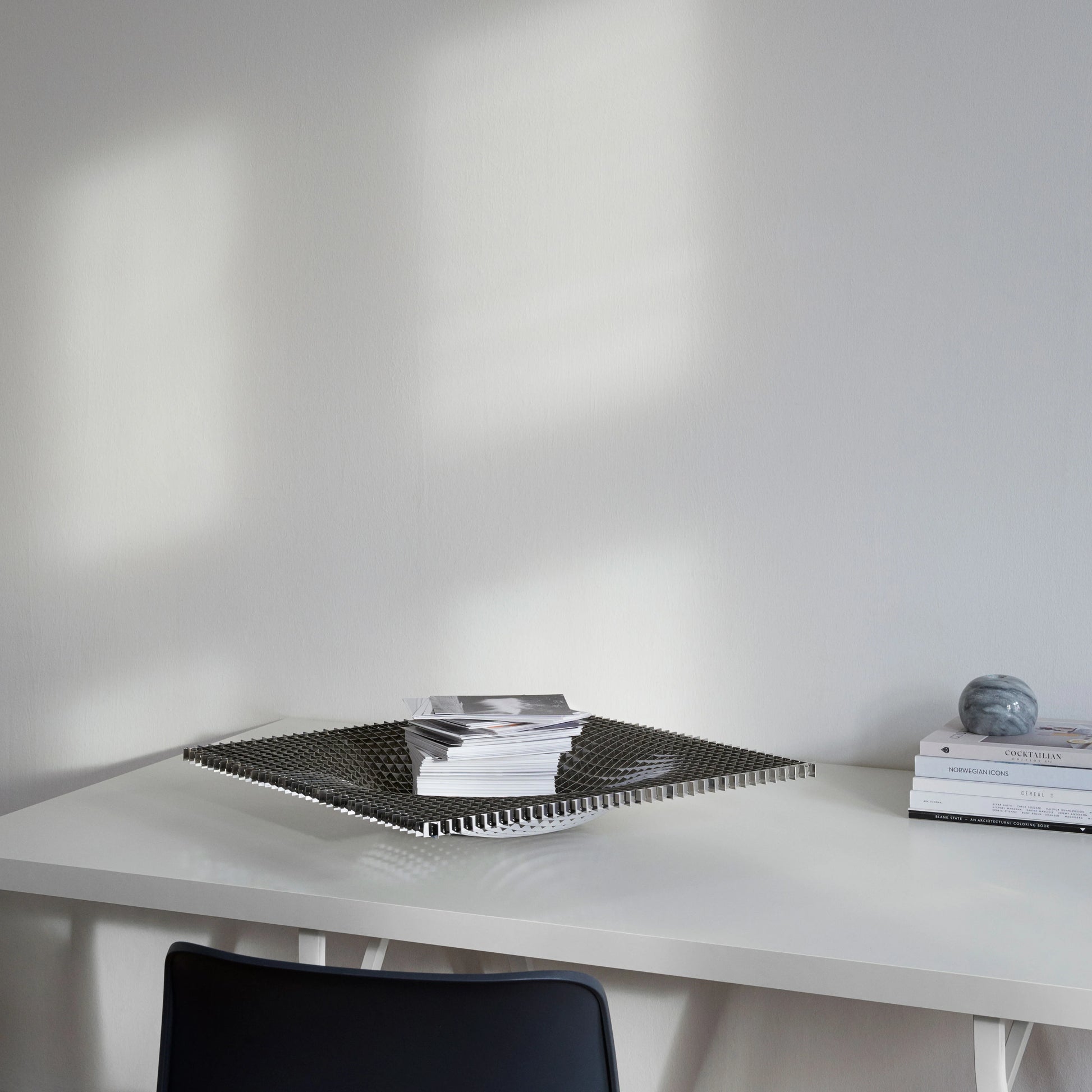 Die GRAVITY Serie spielt mit der Idee der Raumkrümmung: Ein glänzendes, leicht verzogenes Edelstahlgitter wirkt, als würde es von unsichtbaren Kräften geformt. Die Elemente des Gitters sind so ineinander verriegelt, dass sie flexibel bleiben – für subtile Variation und maximale visuelle Spannung.