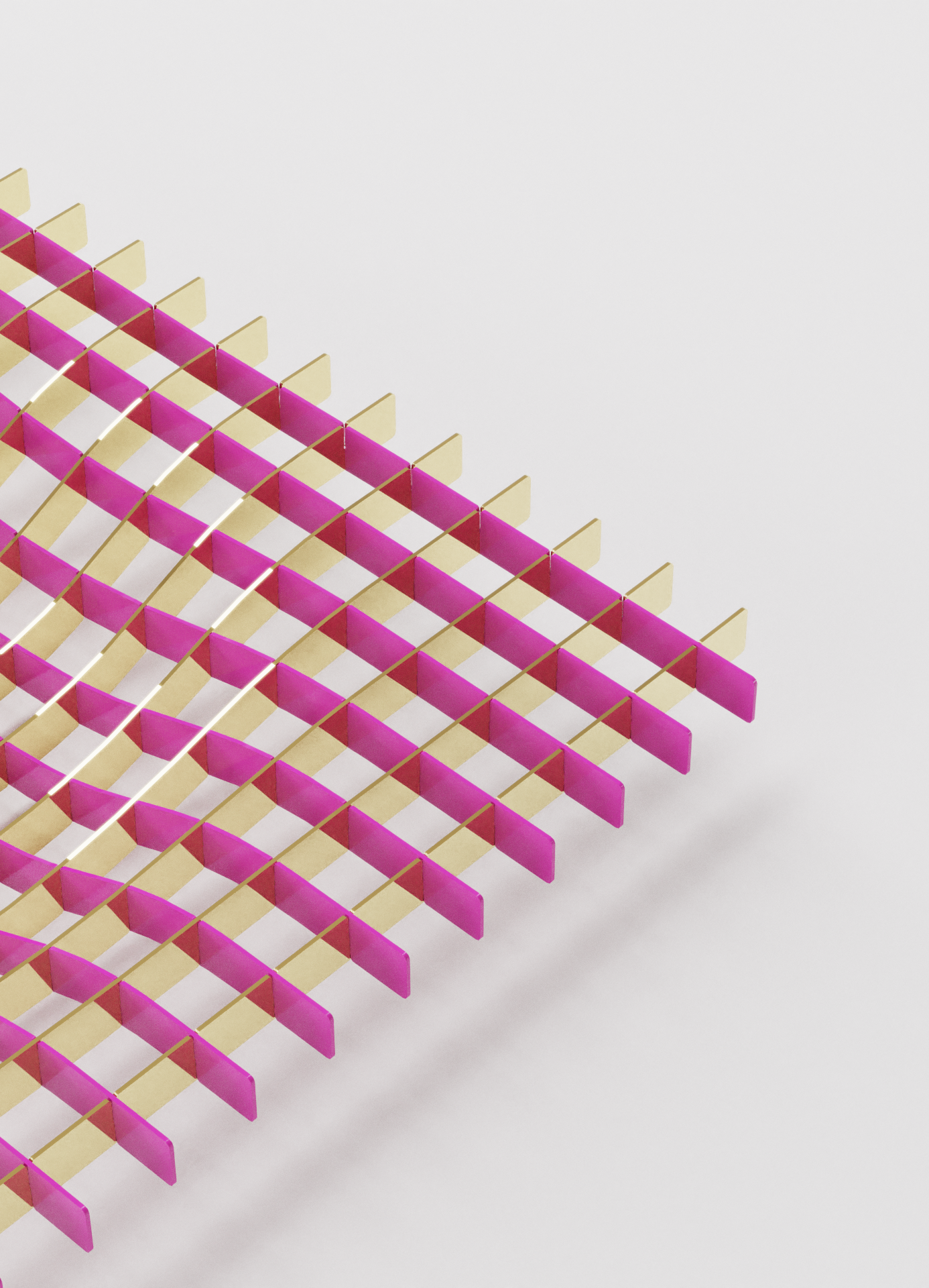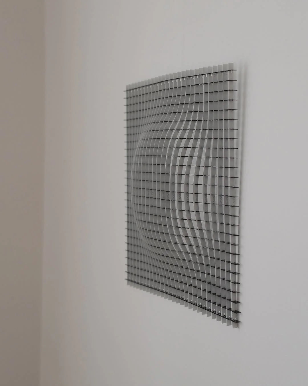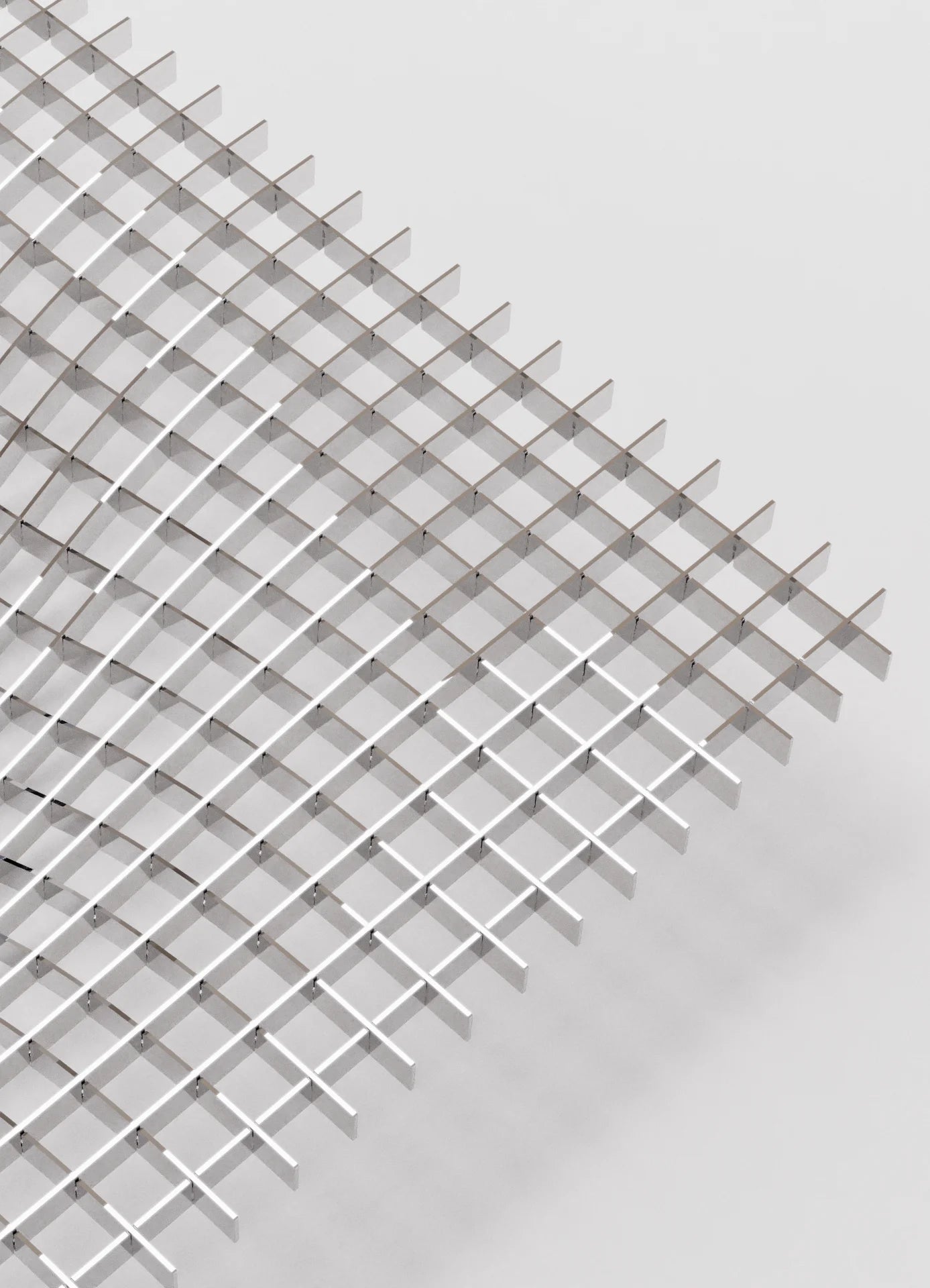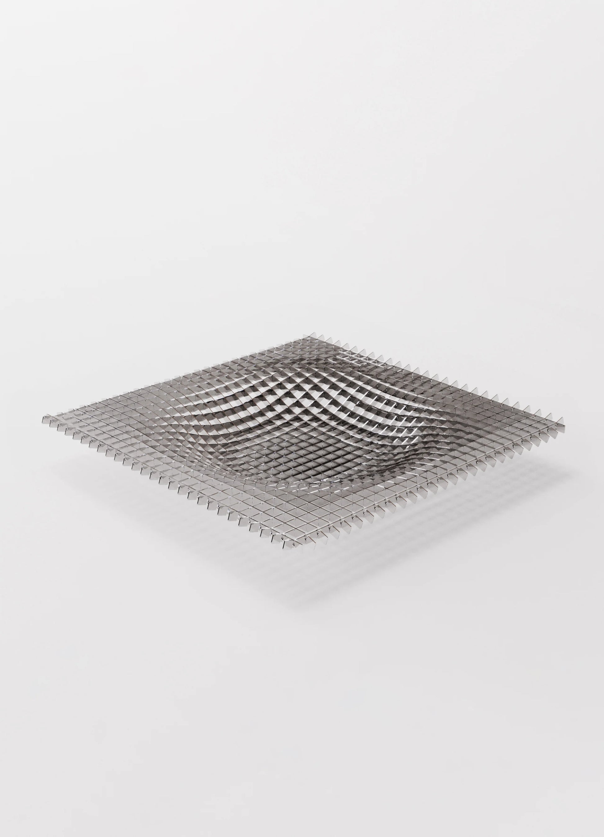 Ein skulpturales Edelstahl-Objekt, dessen verzogenes Gitter futuristische Raumkrümmung zitiert und sich dank flexibler Konstruktion individuell ausrichten lässt.