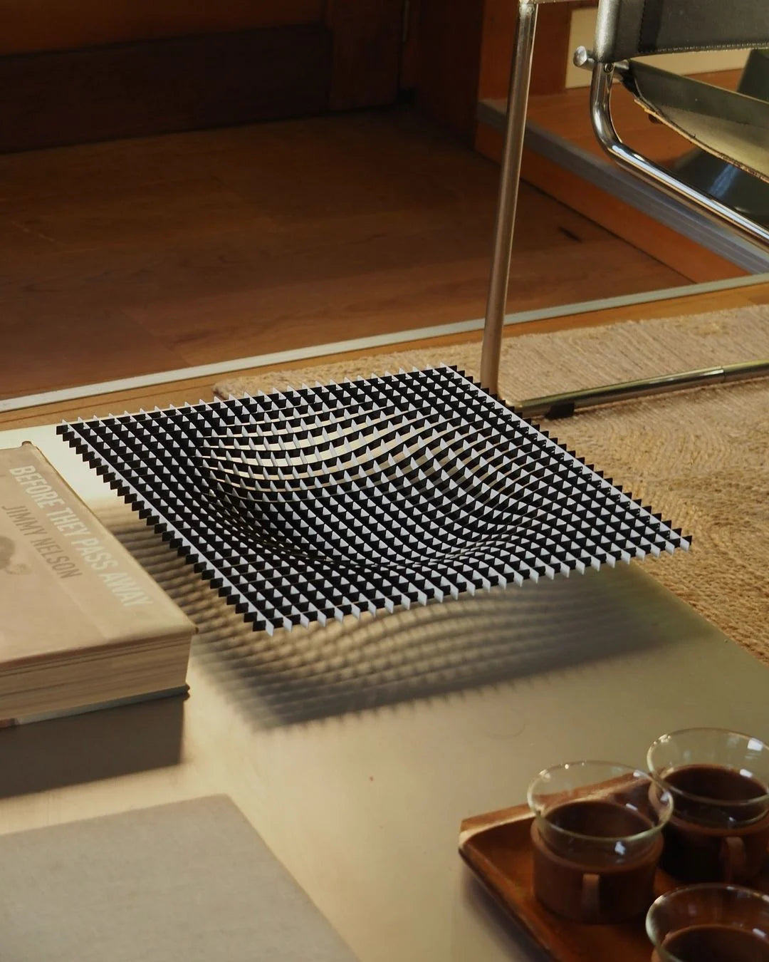 Gefertigt wird das Objekt in Italien aus hochwertigem Edelstahl und anschließend wird es in Berlin montiert. Das Ergebnis ist ein funktionales, zugleich experimentelles Designstück, das als Tischobjekt, Unterlage oder dekorativer Akzent gleichermaßen wirkt.