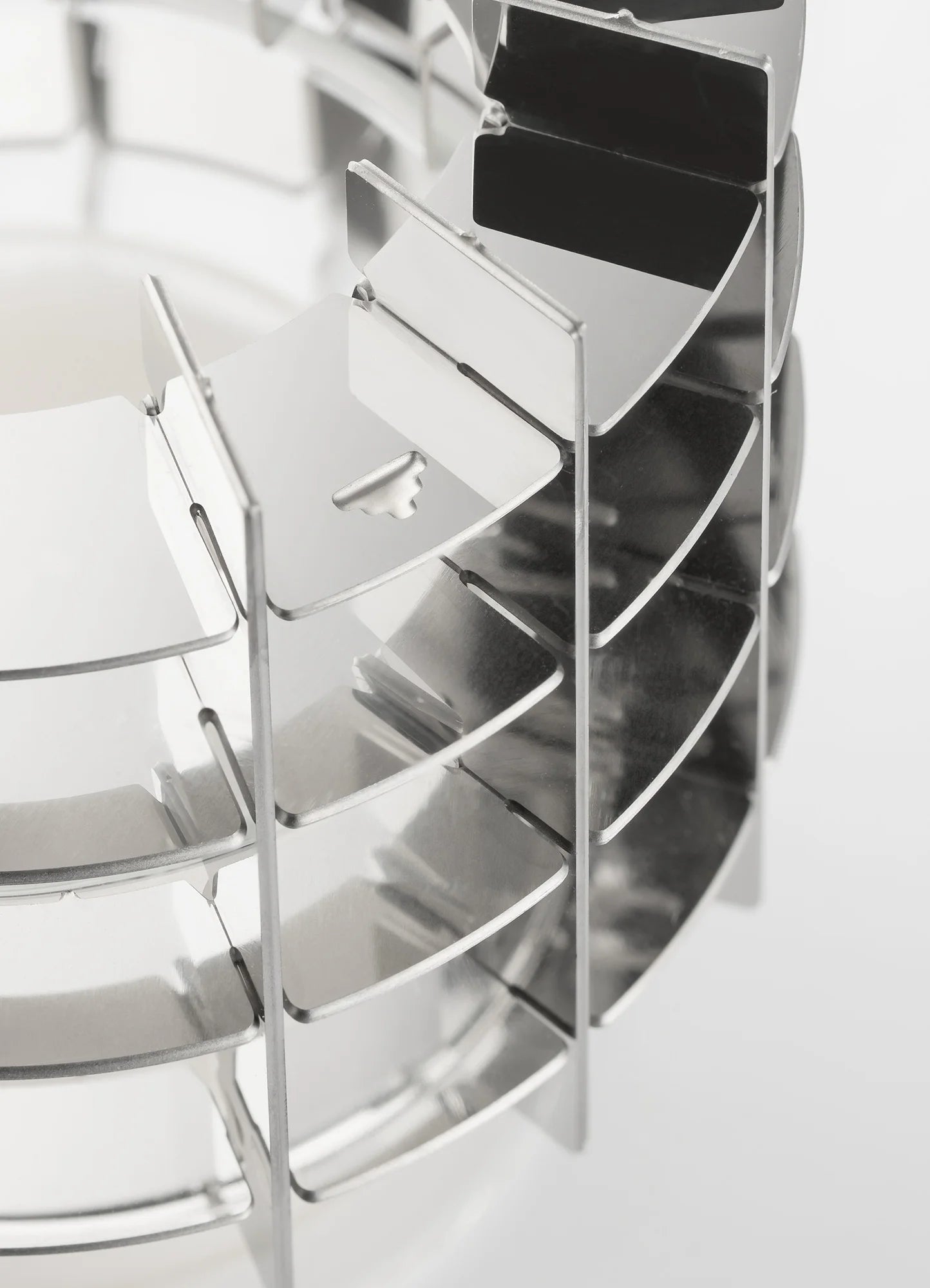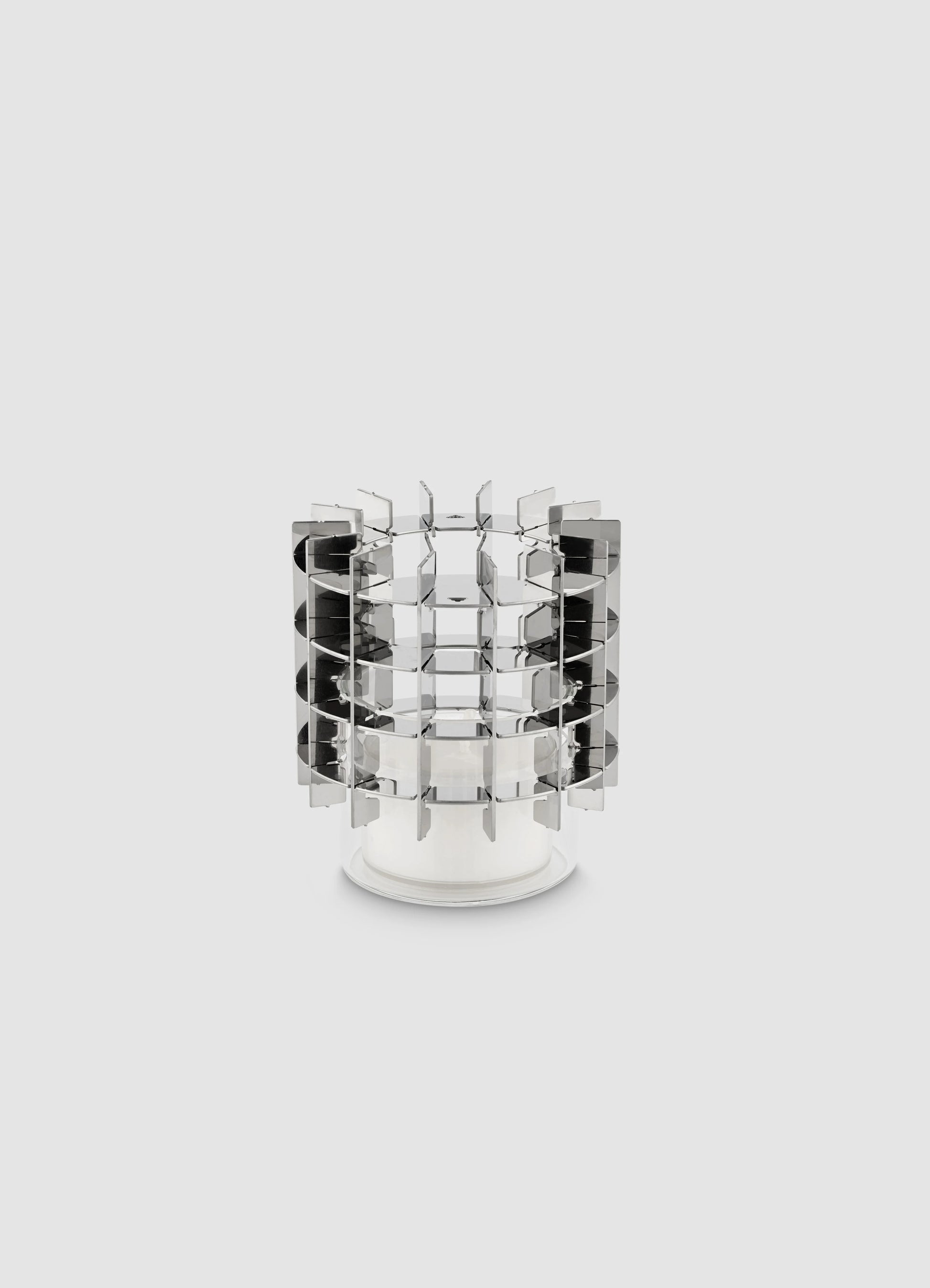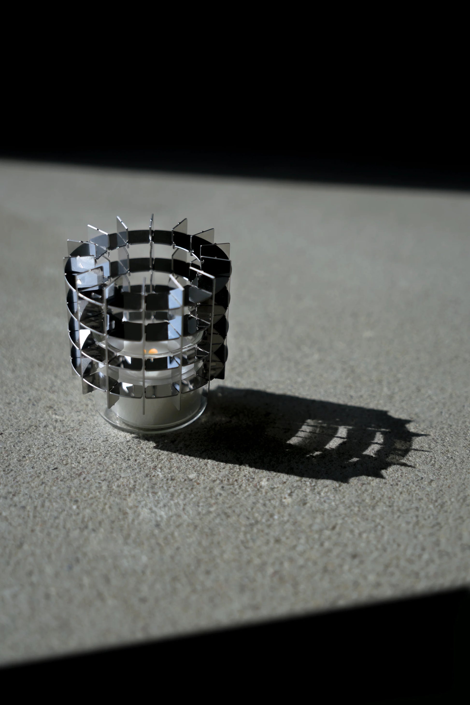 Der GRAVITY Teelicht Halter verwandelt ein simples Teelicht in ein kleines, schimmerndes Spektakel. Ein glänzendes, leicht verzogenes Edelstahlgitter umschließt ein klares Glasgefäß und erzeugt ein faszinierendes Spiel aus Licht, Schatten und Reflektionen.