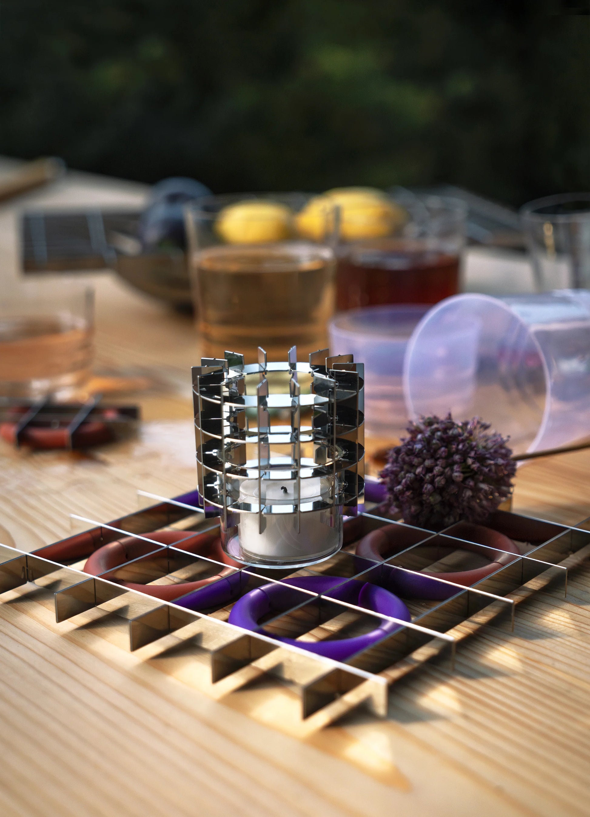 Das verzogene Edelstahlgitter bricht das Kerzenlicht auf besondere Weise und erzeugt schimmernde Reflexe, die an die charakteristische GRAVITY-Ästhetik erinnern.