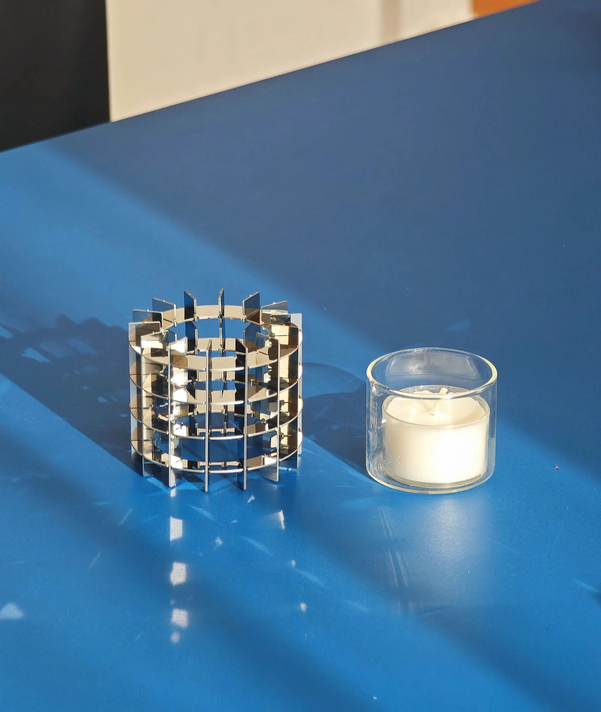 Ein verzerrtes Edelstahlgitter als leuchtende Mini-Skulptur, das jedes Teelicht mit futurischem Glanz umhüllt.