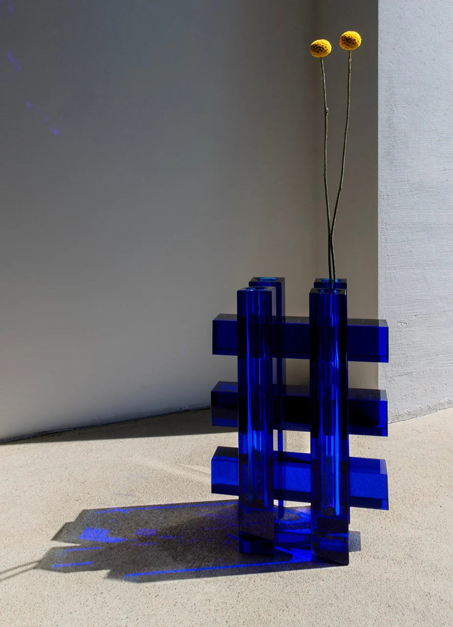 Eine skulpturale Vase aus vier handgeschnittenen und polierten kobaltblauen Kristallglas-Elementen, die sich zu einem markanten, geometrischen Gesamtobjekt zusammensetzen.
