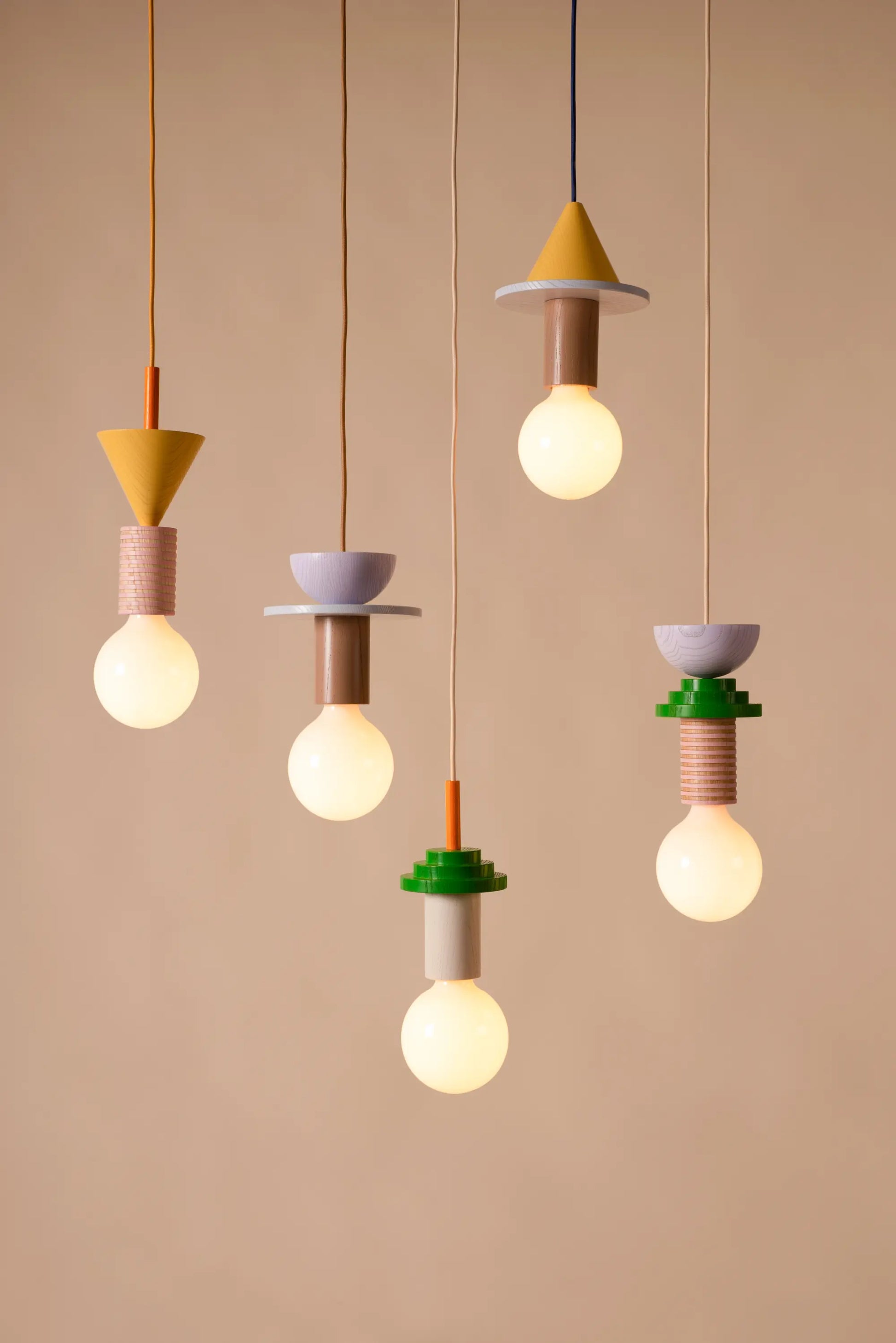 Eine modulare Designleuchte, inspiriert von der Bauhaus-Bewegung, die geometrische Formen, Farbe und Material zu einem skulpturalen Lichtobjekt verbindet.