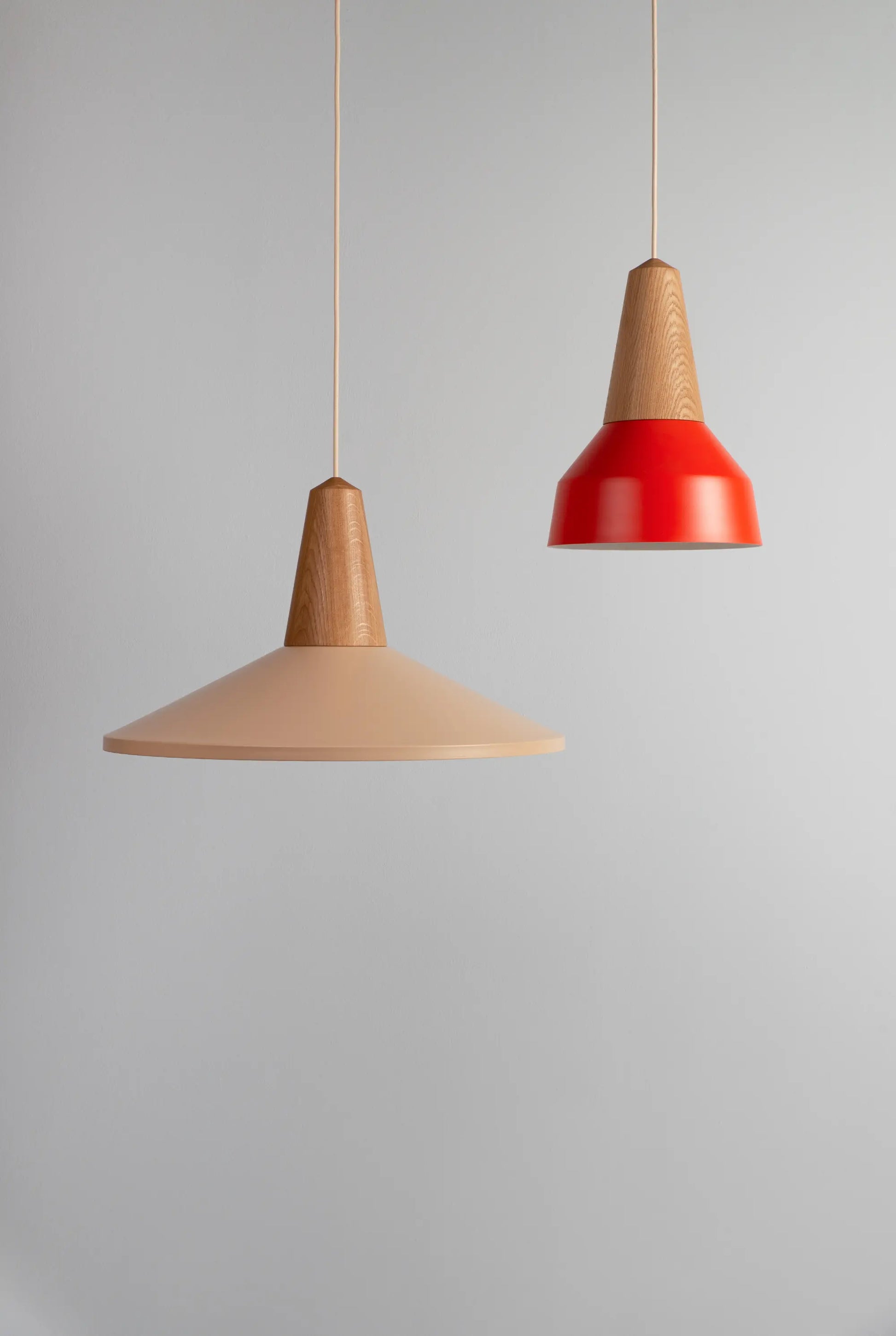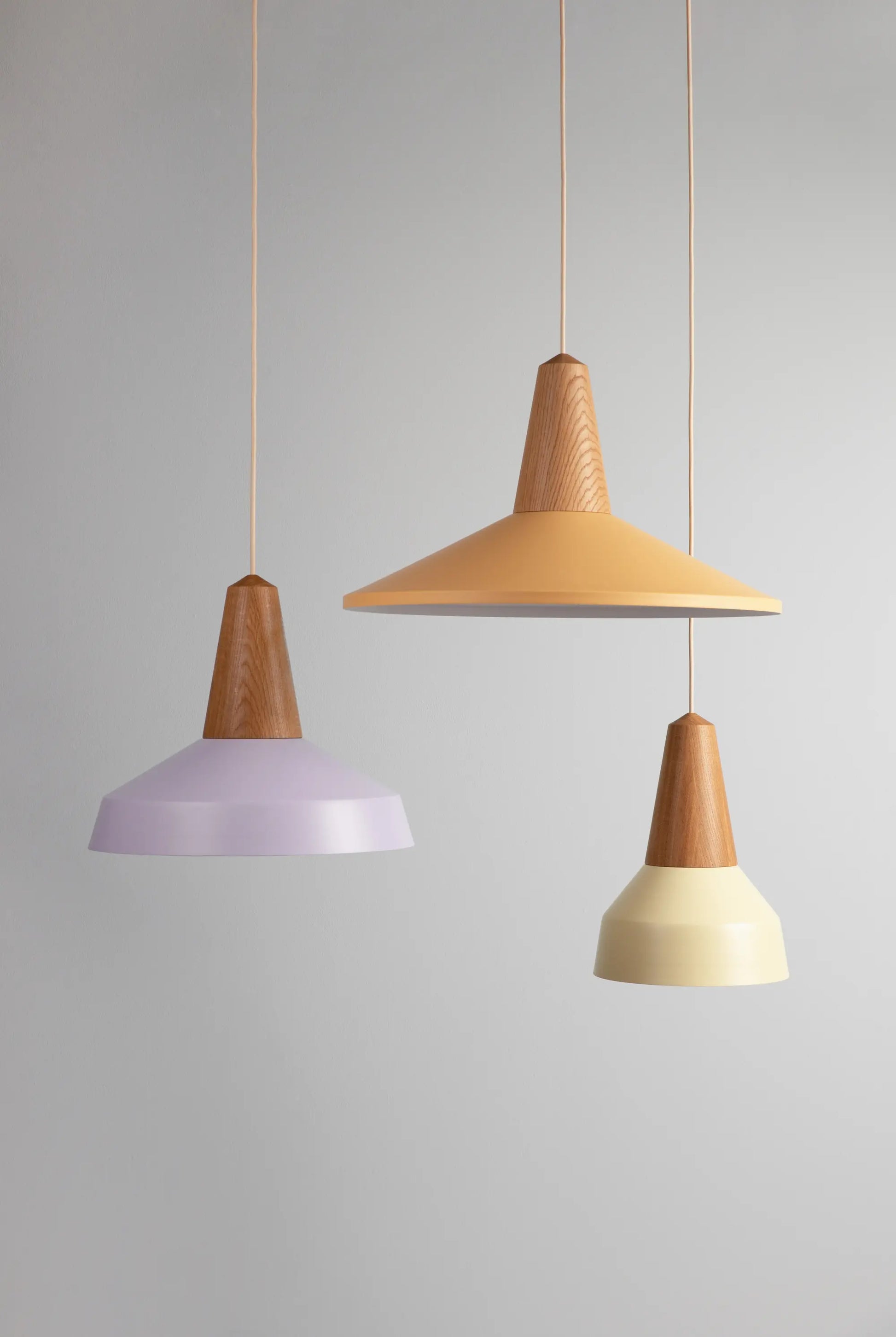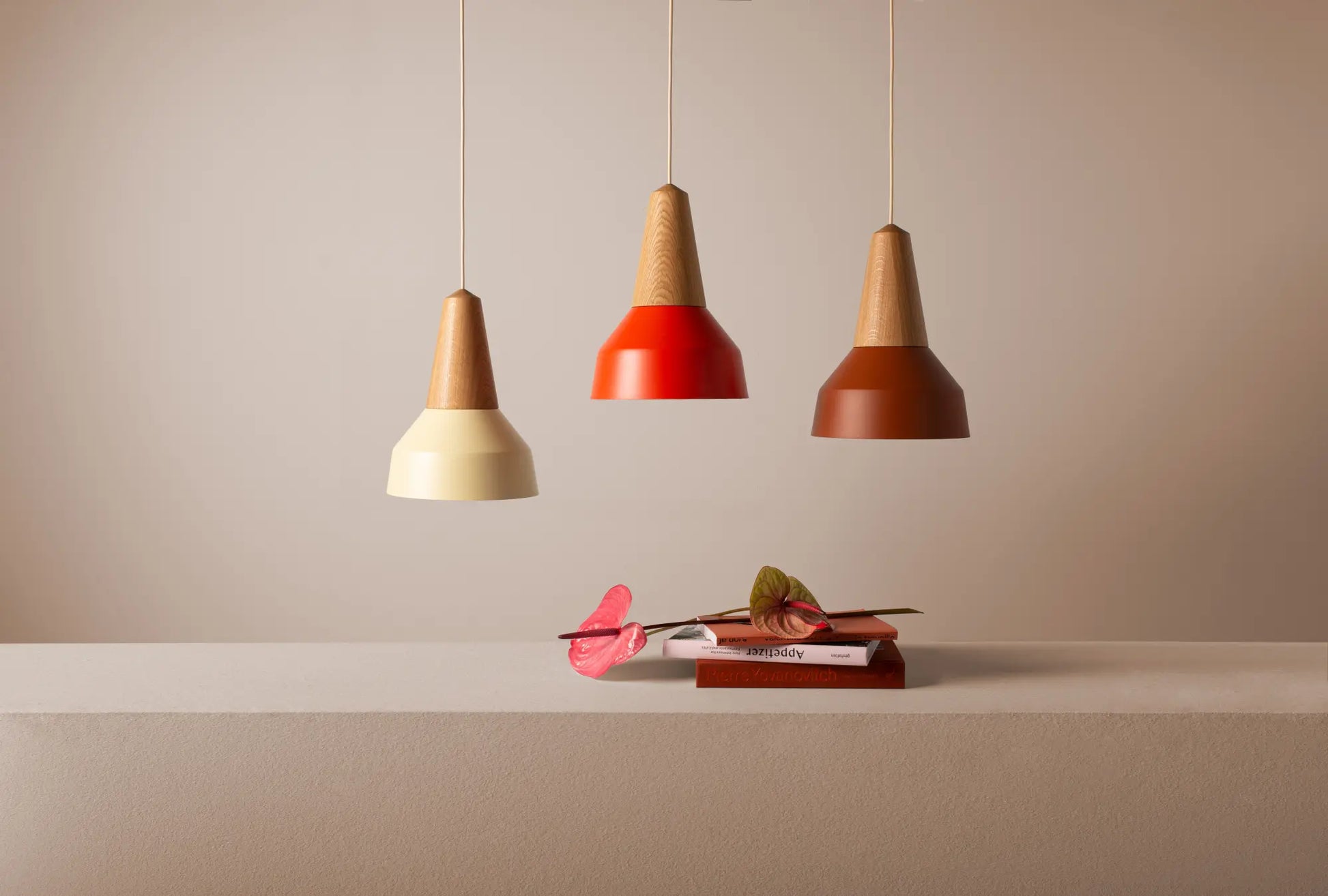 Holzart und Schirmfarbe können bei der Auswahl frei kombiniert werden und ermöglichen unterschiedliche Zusammenstellungen innerhalb derselben Form. Ob als einzelne Leuchte oder in einer Gruppe arrangiert: Eikon bringt Farbe, Form und Material in ein ruhiges Gleichgewicht.