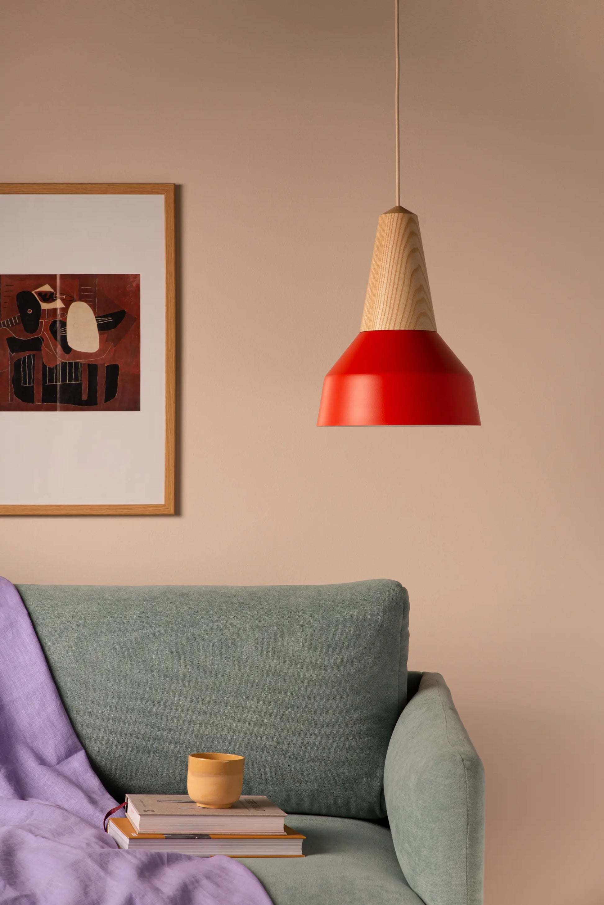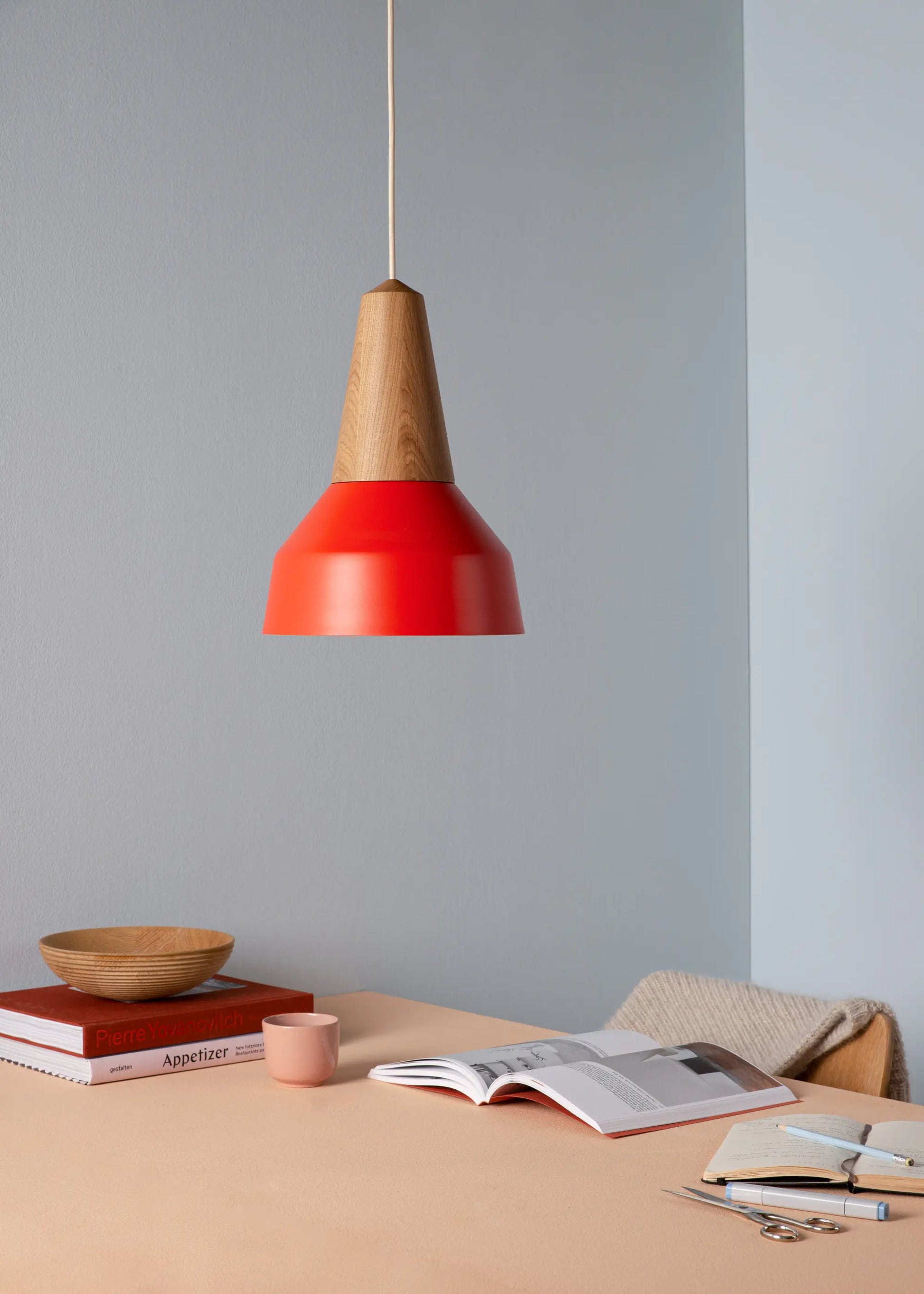 Eine Pendelleuchte mit klarer Formensprache, die sich über Holzart und Schirmfarbe individuell konfigurieren lässt.