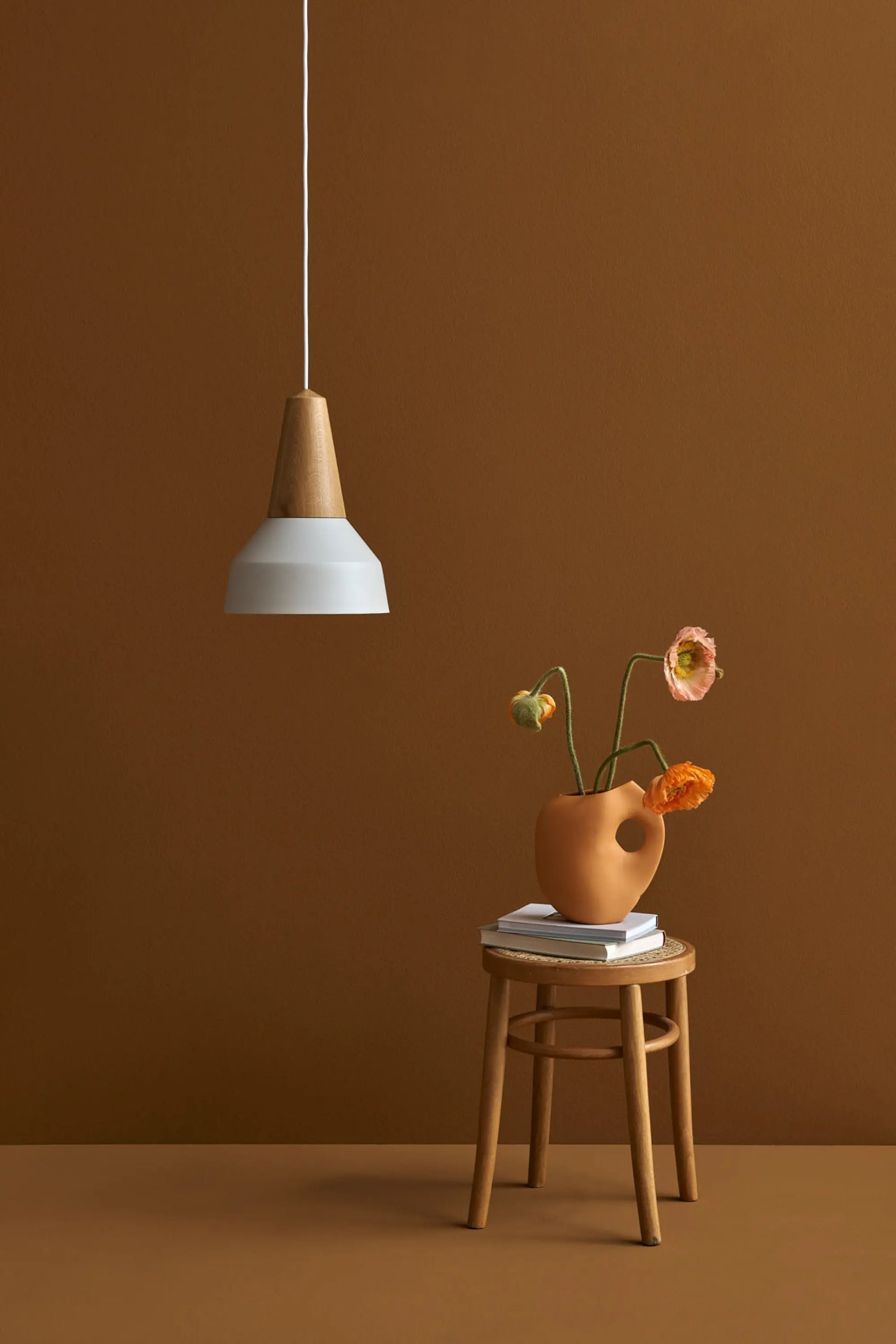 Durch die Wahl von Holzart und Schirmfarbe lässt sich die Leuchte auf unterschiedliche Raumstimmungen abstimmen.Farbpalette mit Charakter