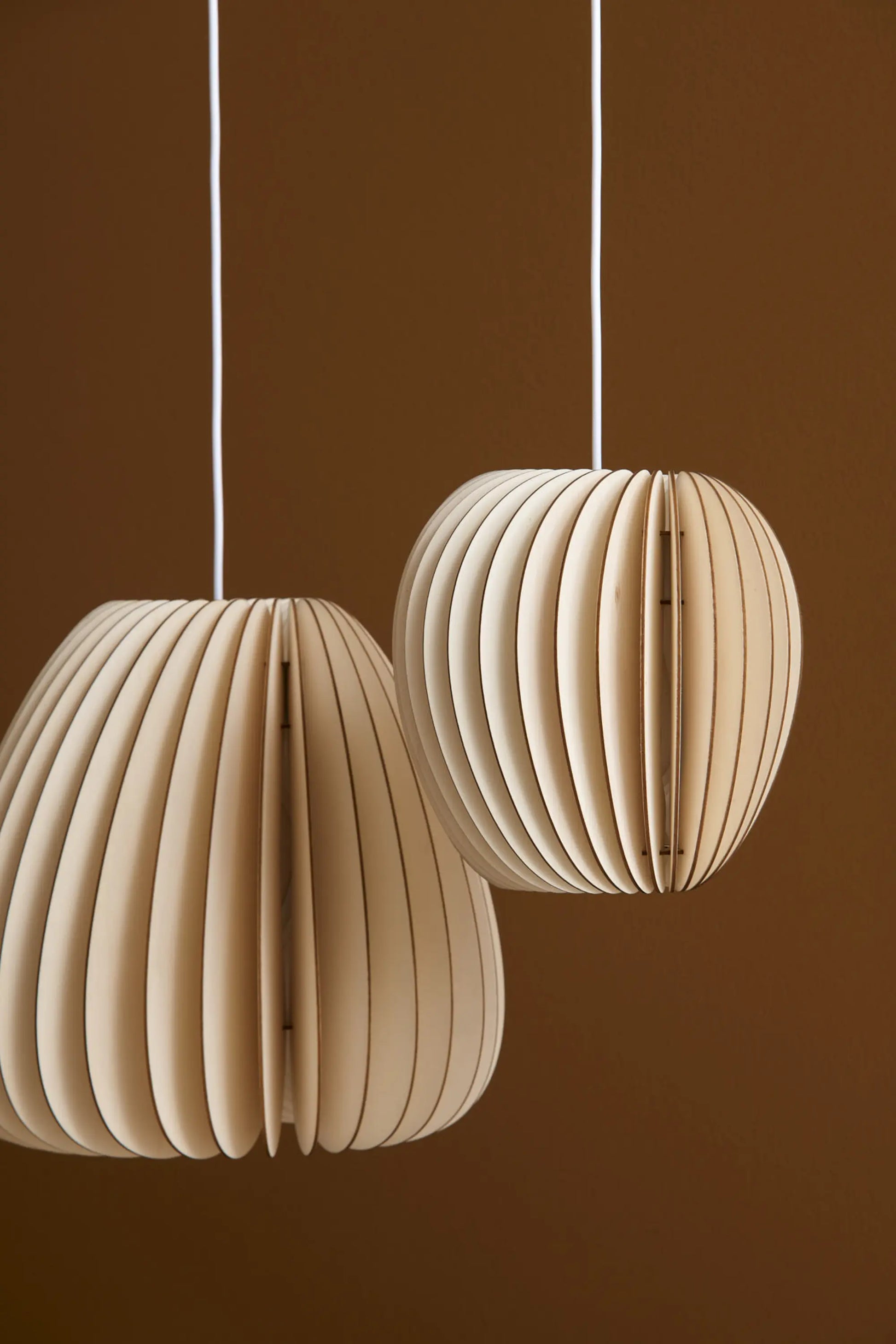 Die filigrane Struktur aus schräg angeordneten Holzlatten lässt das Licht sanft durchscheinen und erzeugt ein angenehmes, blendfreies Ambiente. Gefertigt aus unbehandeltem Holz und von Hand im eigenen Studio hergestellt, verkörpert Pirum eine ruhige, reduzierte Gestaltung mit klarem Fokus auf Material und Lichtwirkung.