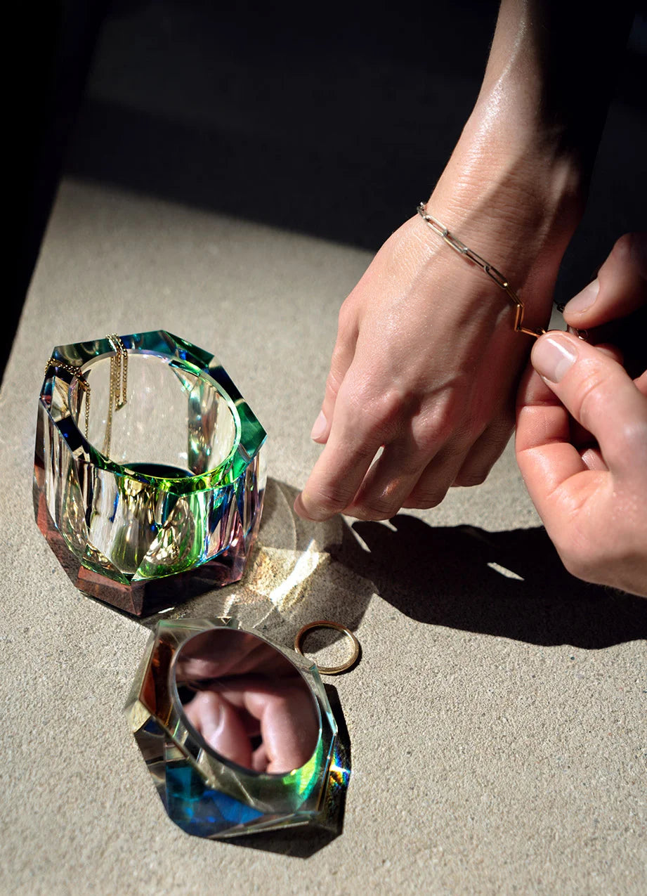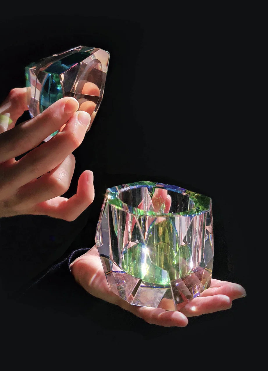 Handgefertigte Kristallglasbox mit chromatischer Unterseite, die Licht in verstärkten Regenbogenfarben bricht und farbintensive Akzente im Raum setzt.