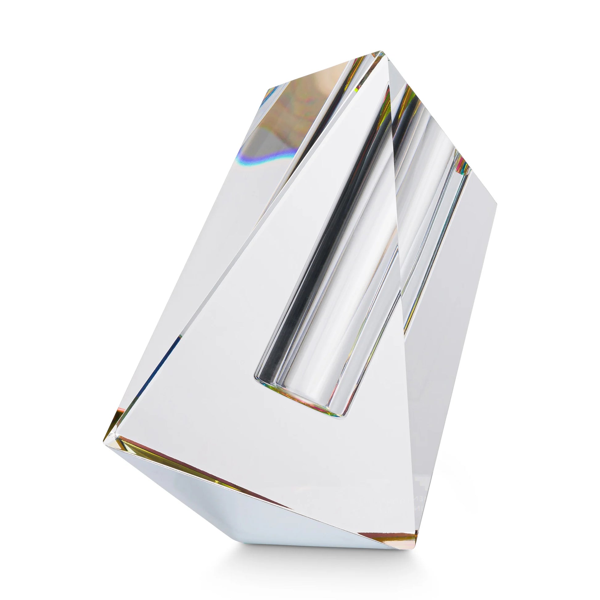Die asymmetrische Vase aus der Rainbow Collection besteht aus massivem, handgeschnittenem Kristallglas und ist so gestaltet, dass sie leicht angewinkelt präsentiert wird – ideal für charakteristische, japanisch inspirierte Blumenarrangements. Die klare, kantige Form sorgt für eine starke Präsenz und macht die Vase zu einem besonderen Blickfang im Raum.