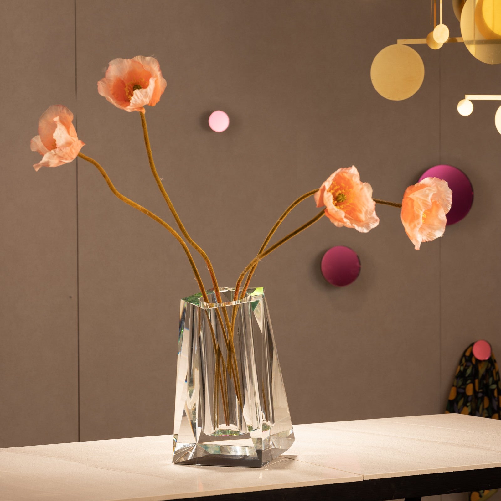 Mit ihrer massiven Glasstruktur und der auffälligen Geometrie eignet sich die Vase besonders für ausdrucksstarke Blumenarrangements oder als skulpturales Objekt für sich.