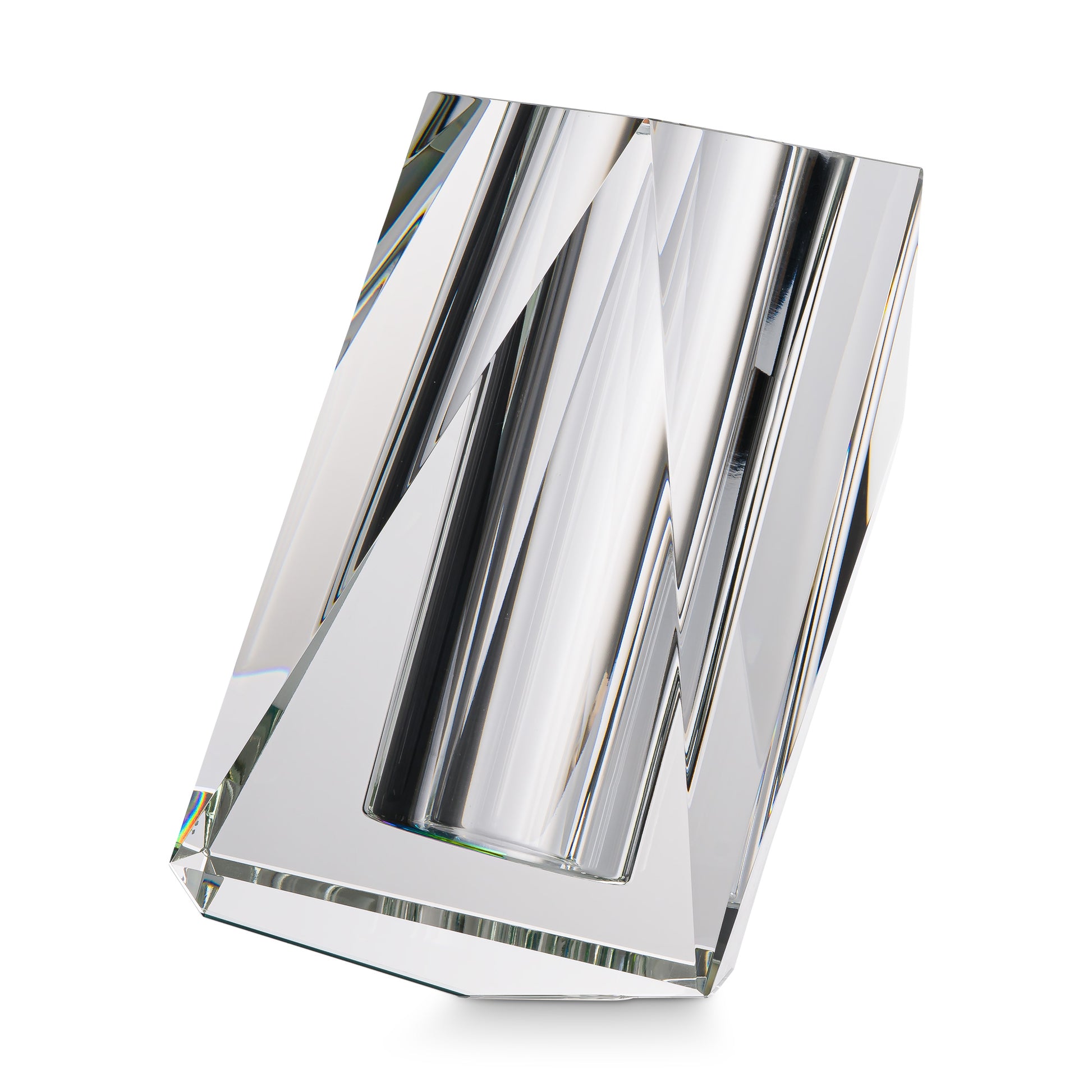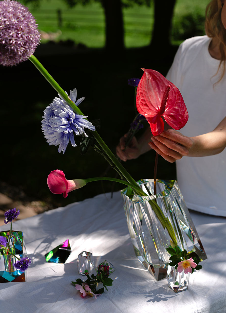 Die große Rainbow Vase wird aus massivem, handgeschnittenem und poliertem Kristallglas gefertigt und setzt durch ihre kantige, futuristische Form ein starkes visuelles Statement. Eine dichroische Folie verstärkt den natürlichen Farbeffekts des Kristalls und erzeugt ein lebendiges Regenbogenspiel, das je nach Perspektive und Lichtsituation variiert.