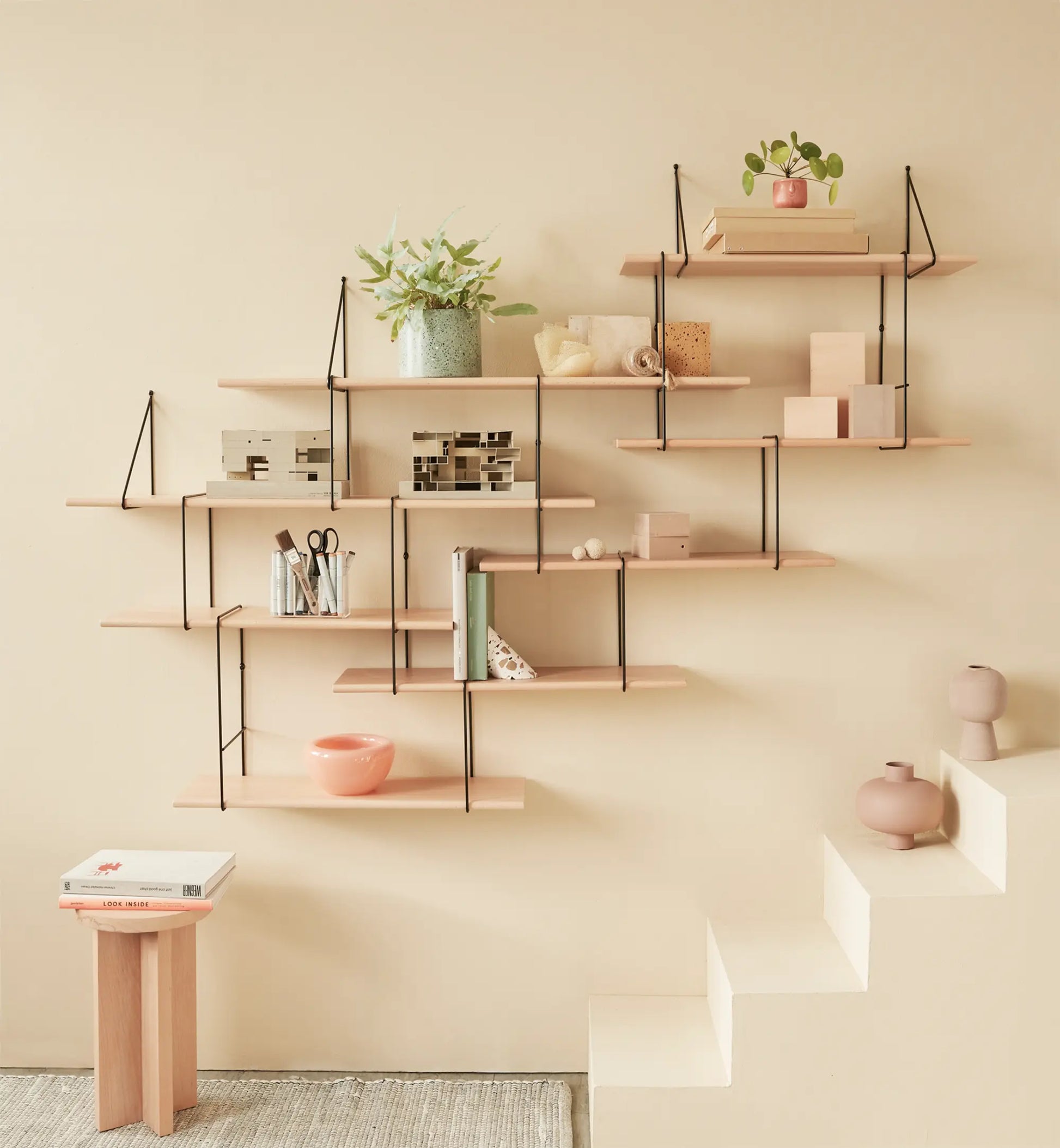 Ein modulares Wandregal aus Massivholz mit pulverbeschichteten Stahlbügeln, bestehend aus zwei kombinierbaren Elementen des Link-Regalsystems.