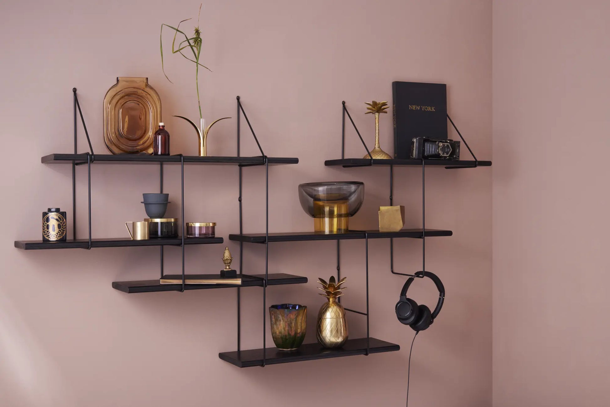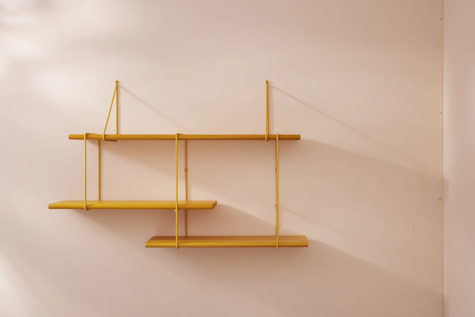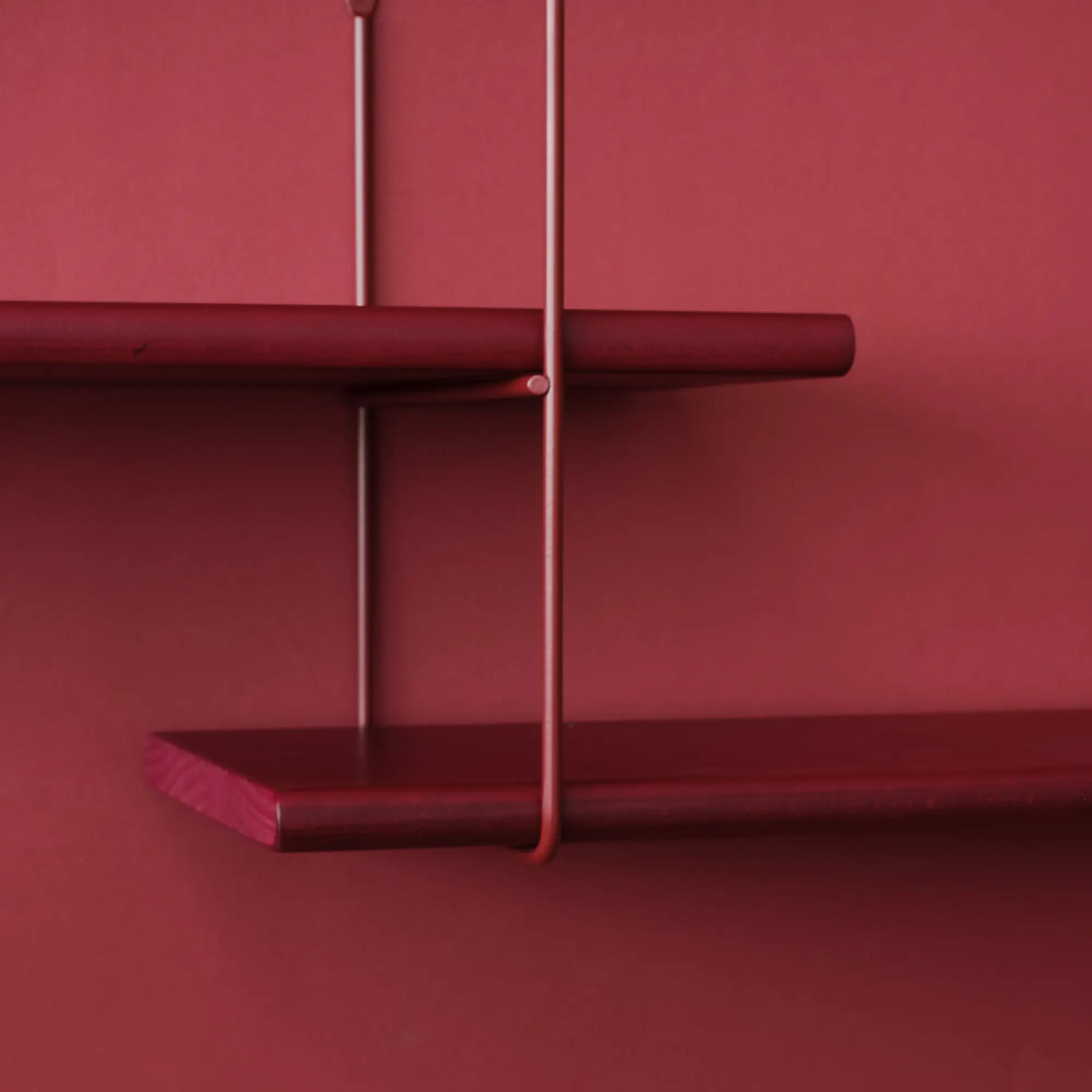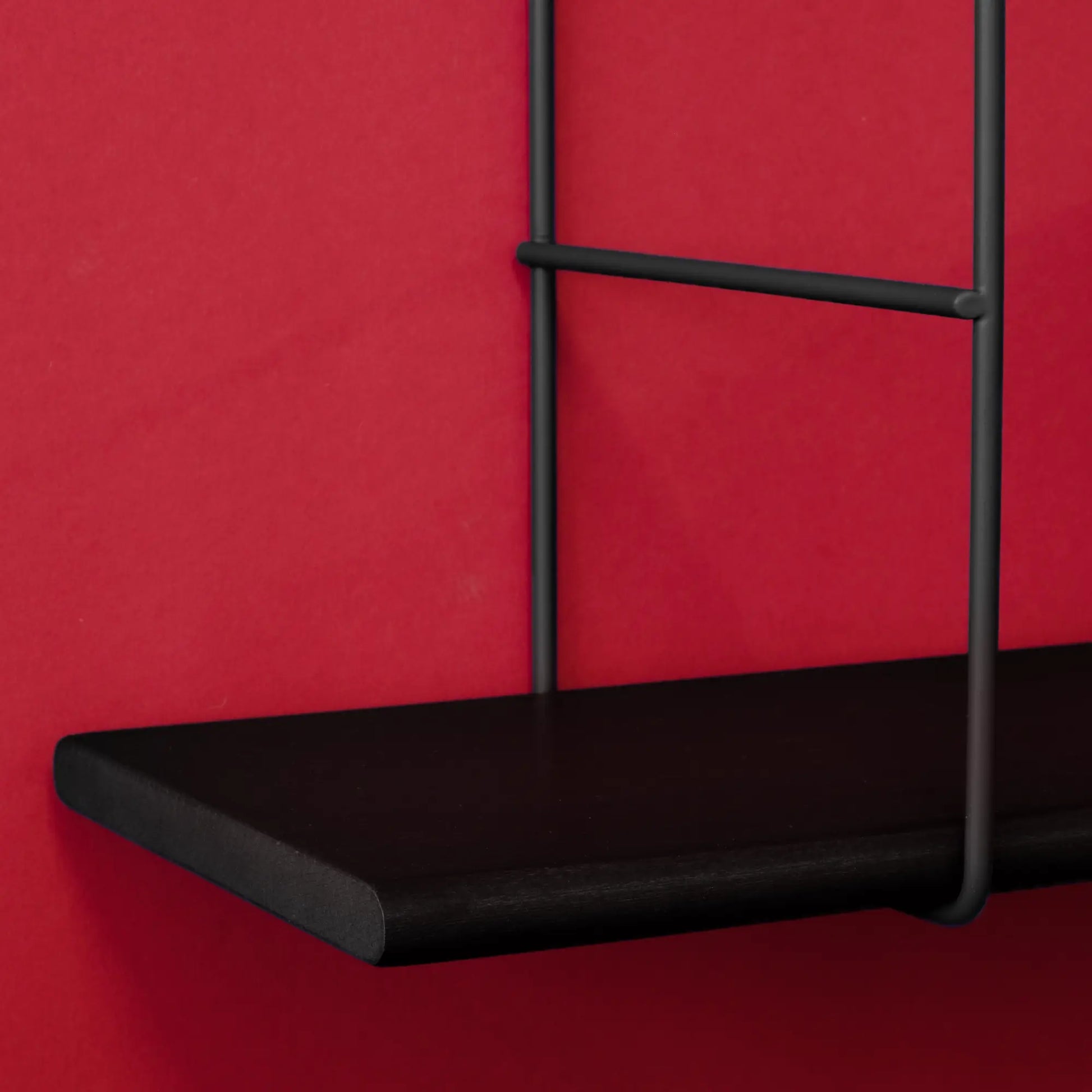 Ein modulares Wandregal aus massivem Buchenholz mit pulverbeschichteten Stahlbügeln, Teil eines erweiterbaren Regalsystems.