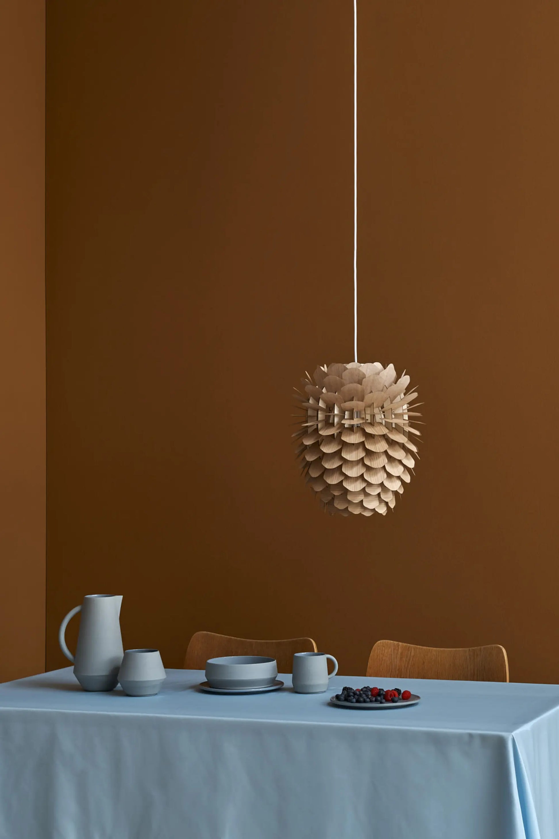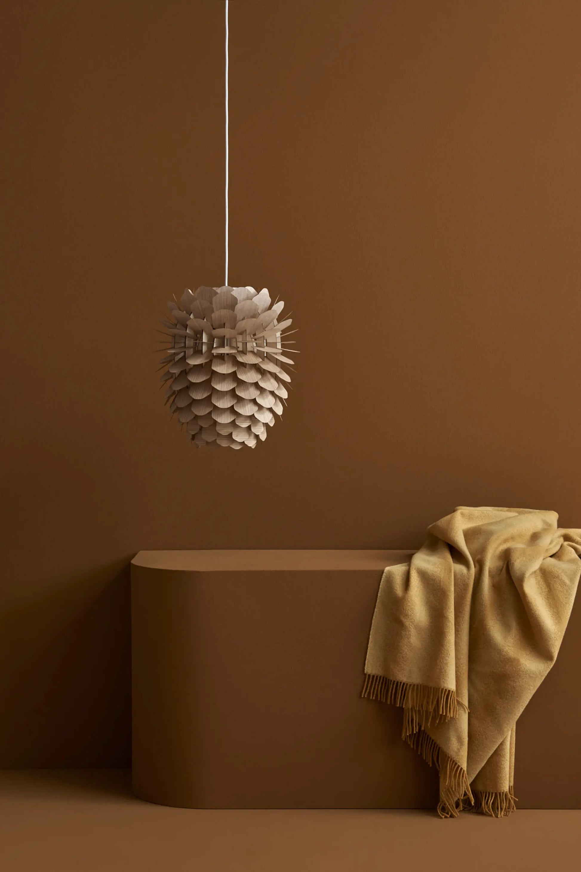 Eine skulpturale Pendelleuchte aus feinem Holzfurnier, die mit sanftem Licht und ruhiger Präsenz eine warme Atmosphäre schafft.